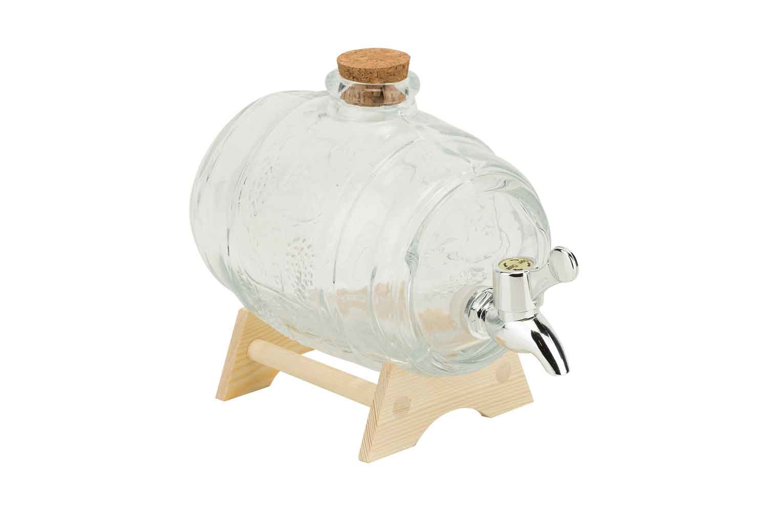 Deze prachtige drankendispenser heeft een uniek design in de vorm van een wijnvat, mooi versierd met een reliëftekening van wijnranken. Het gat bovenaan om de dispenser te vullen is afgesloten met een kurk; laat deze kurk eraf om met het kraantje de glazen te vullen, anders trekt de dispenser vacuüm, waardoor u niet meer zult kunnen schenken. Het vaatje steunt op een houten standaard, maar staat ook zonder die standaard in balans, dankzij de voetjes aan de onderkant.