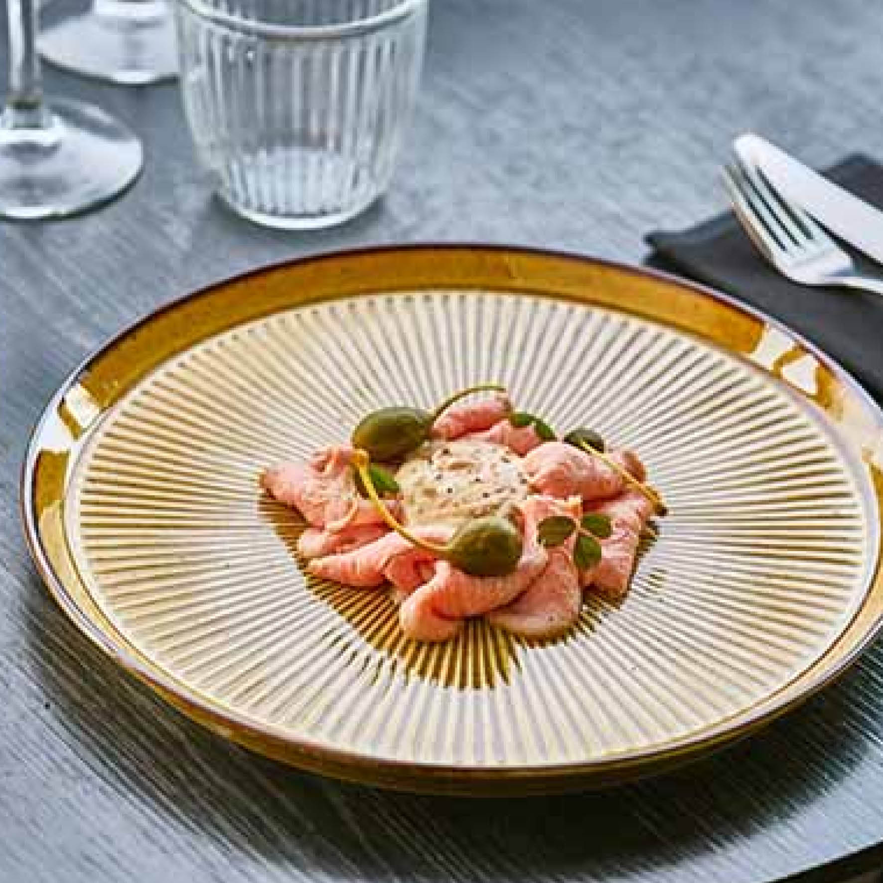 De Solas Proof serie, verkrijgbaar in Blue en Mustard heeft een mooi voelbaar stralen patroon. De ribbels en de warme bruine rand geven je gerechten een verfijnde maar krachtige omlijsting. Gemaakt van hoogwaardig porselein dat bestand is tegen intensief gebruik in professionele keukens. Stapelbaar, vaatwasser- en magnetron bestendig. Porselein set, compleet met diverse borden, schalen, kommetjes, kop en schotel, en een Beker.